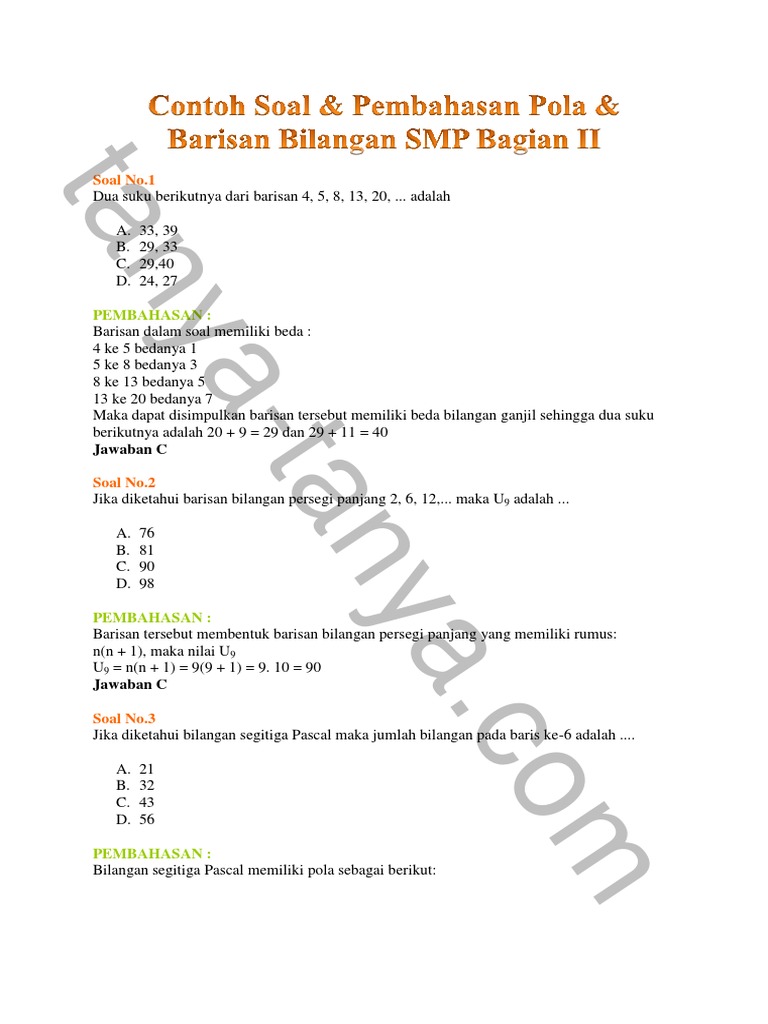 Soal dan pembahasan latihan olimpiade nasional smp 1 10 istana. Seorang anak membuat kerangka segitiga dari batang lidi dengan mengikuti pola sebagai berikut. Pola bilangan aritmatika berderajat dua. Cara kedua menyelesaikan soal barisan bilangan. Macam jenis dan contoh pola bilangan sebelum mempelajari barisan aritmatika dan barisan geometri, ada sub bab materi barisan bilangan atau bab yang perlu dipahami terlebih dahulu yaitu pola bilangan? Barisan bilangan adalah suatu urutan bilangan dengan pola tertentu. Rumus segitiga pascal dan contoh soalnya. Rumus segitiga pascal dan contoh soalnya from rumus.co.id. Terima kasih telah mengunjungi blog contoh soal. Contoh soal pola dan barisan bilangan ini disusun dalam bentuk pilihan berganda dilengkapi dengan pembahasan dan dirancang sedemikian contoh soal baris dan deret beserta penjelasanya. Contoh soal vektor dan pembahasannya beserta jawabannya. Hal tersebut sesuai dengan perhitungan pola bilangan barisan aritmatika, sebagai berikut 20200818 di bawah ini terdapat beberapa contoh soal transformasi geometri beserta keliling sisi 1 sisi 2 sisi 3.