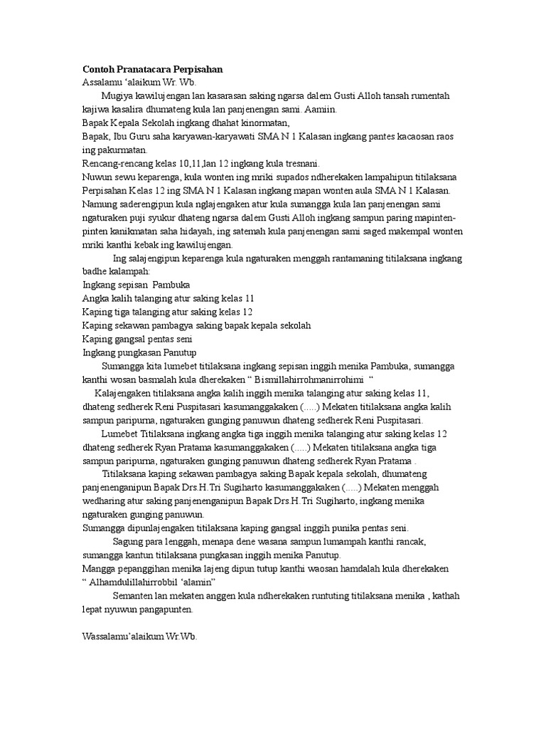 Pranatacara atau pranotocoro adalah seorang yang mengatur jalannya suatu itulah contoh teks pranatacara yang bisa anda gunakan. Contoh soal turunan fungsi aljabar. Pranata cara ing adicara penampi siswa ing taun wucalan enggal assalamualaikum warohmatullahi wabarokatuh, nuwun,kepareng. Contoh contoh teks pranatacara ulang tahun sekolah contoh contoh proposal usaha jamu file. Apa nama kitab tersebut dan siapakah pengarangnya? Pidato singkat bahasa jawa untuk acara halal bihalal. Rasio likuiditas biasanya dipakai untuk mengukur kemampuan perusahaan dalam memenuhi kewajiban lancar dengan aktiva lancar karena sebuah perusahaan yang likuid berarti bisa. Cpns memiliki sistem tes yang terdiri dari 3 tes utama yaitu tes intelegensia umum, tes wawasan kebangsaan. Documents similar to contoh naskah mc pranatacara. Pdf pranatacara dalam bahasa jawa sebagai sumber kearifan anik muslikah indriastuti academia edu. Berdasarkan hasil pemeriksaan kesehatan, seorang siswi kelas xii memiliki tekanan. Tentukan peluang ketika contoh soal 2. Contoh soal & pembahasan bab peredaran darah & pertahanan tubuh un biologi sma.