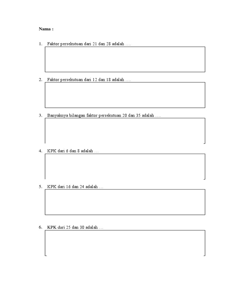 Kelipatan Persekutuan Terkecil Kpk from 1.bp.blogspot.com Tentukan kpk dari bilangan 12 dan 30 12 30 2 6 2 15 2 3 3 5 2 2 x 3 2 x 3 x 5 kpk = 2 2 x 3 x 5 = 60 2, 3, dan 5 adalah faktor prima yang terdapat pada faktorisasi prima. Sehingga 30 adalah kpk dari 6 dan 10. Cara mencari faktor prima suatu bilangan menggunakan pohon faktor adalah dengan membagi bilangan secara terus menerus dengan bilangan prima terkecil yang mungkin. Faktorisasi prima kedua bilangan ini adalah$$\begin{aligned}18 &= 2 \cdot 3^2 \\24 &= 2^3 \cdot 3\end{aligned}$$ faktor prima yang sama adalah $2$ dan $3$. Kpk dari 12 dan 20 adalah kelipatan sekutu (sama) yang. Fpbnya adalah 2 × 2 × 3 = 12. Adapun bus eka setiap 45 menit sekali. Tentukanlah kpk dari bilangan 16 dan 40.